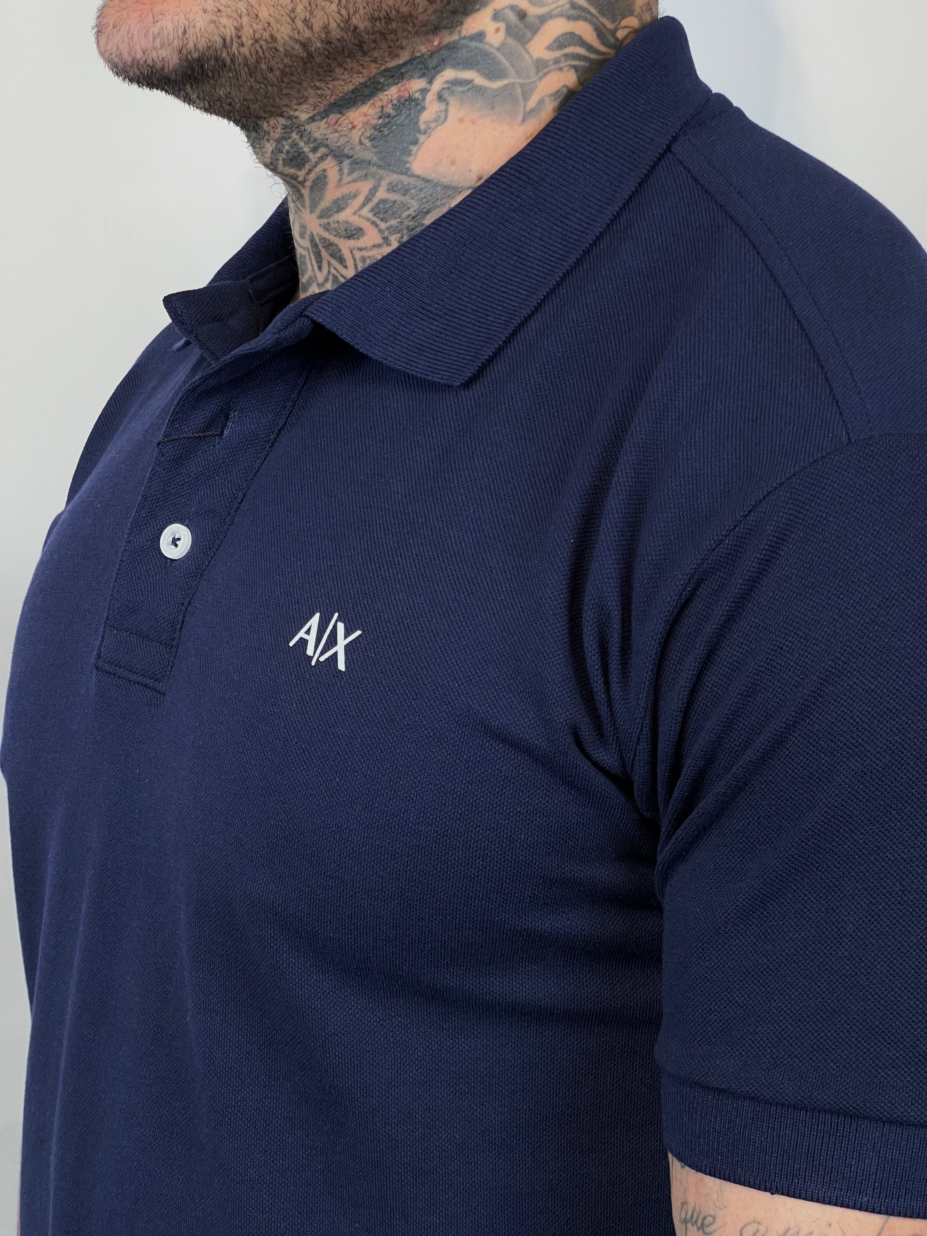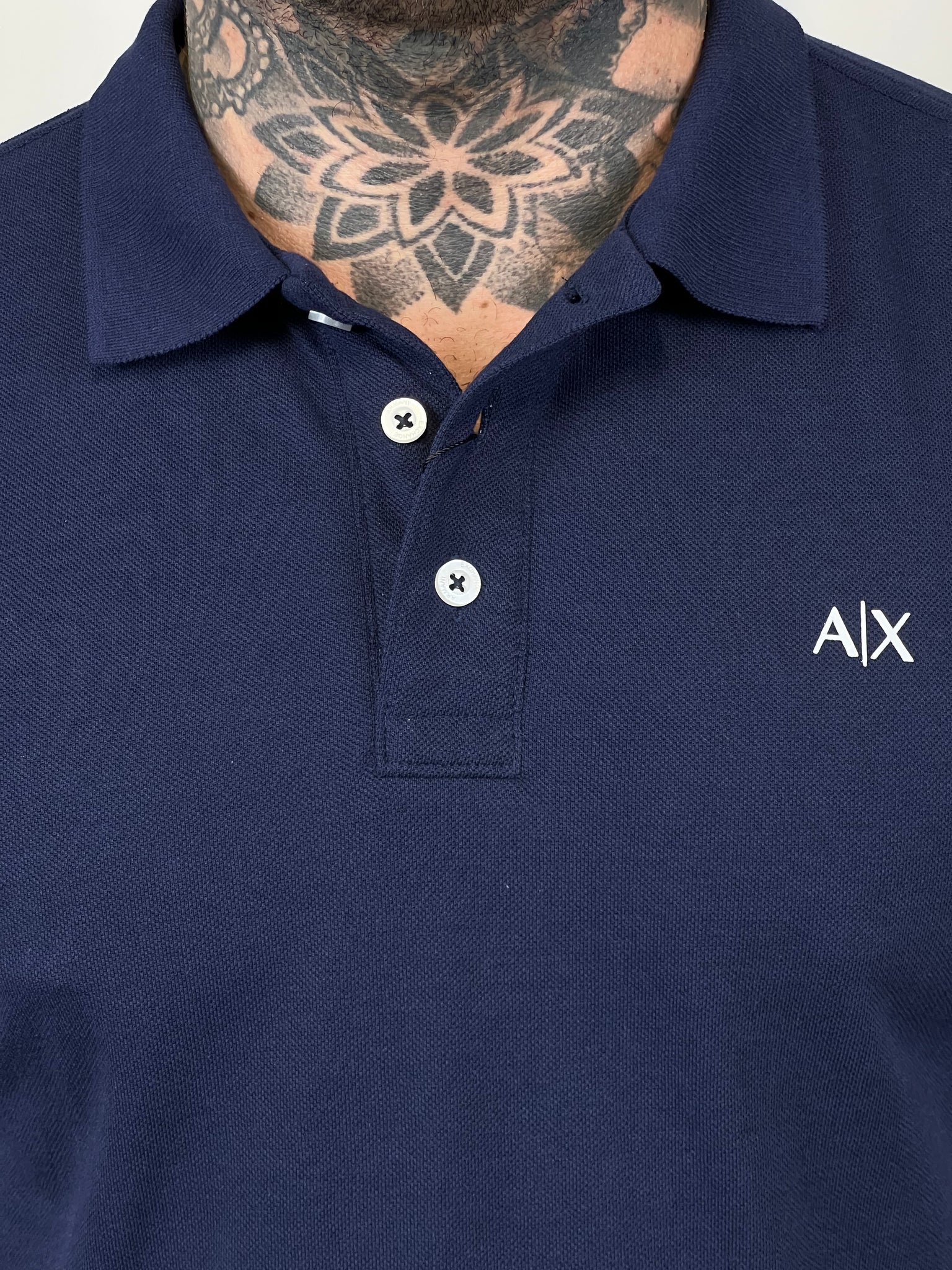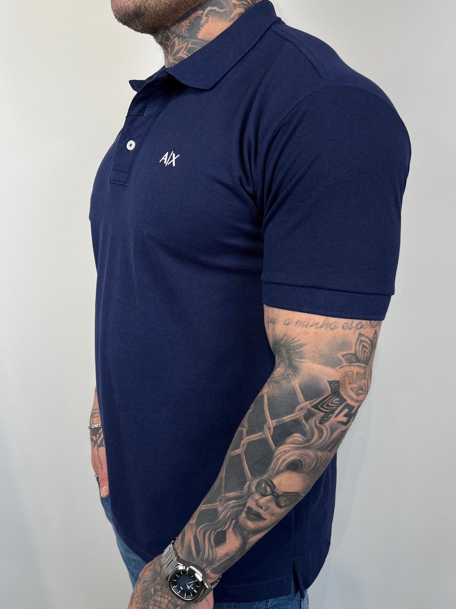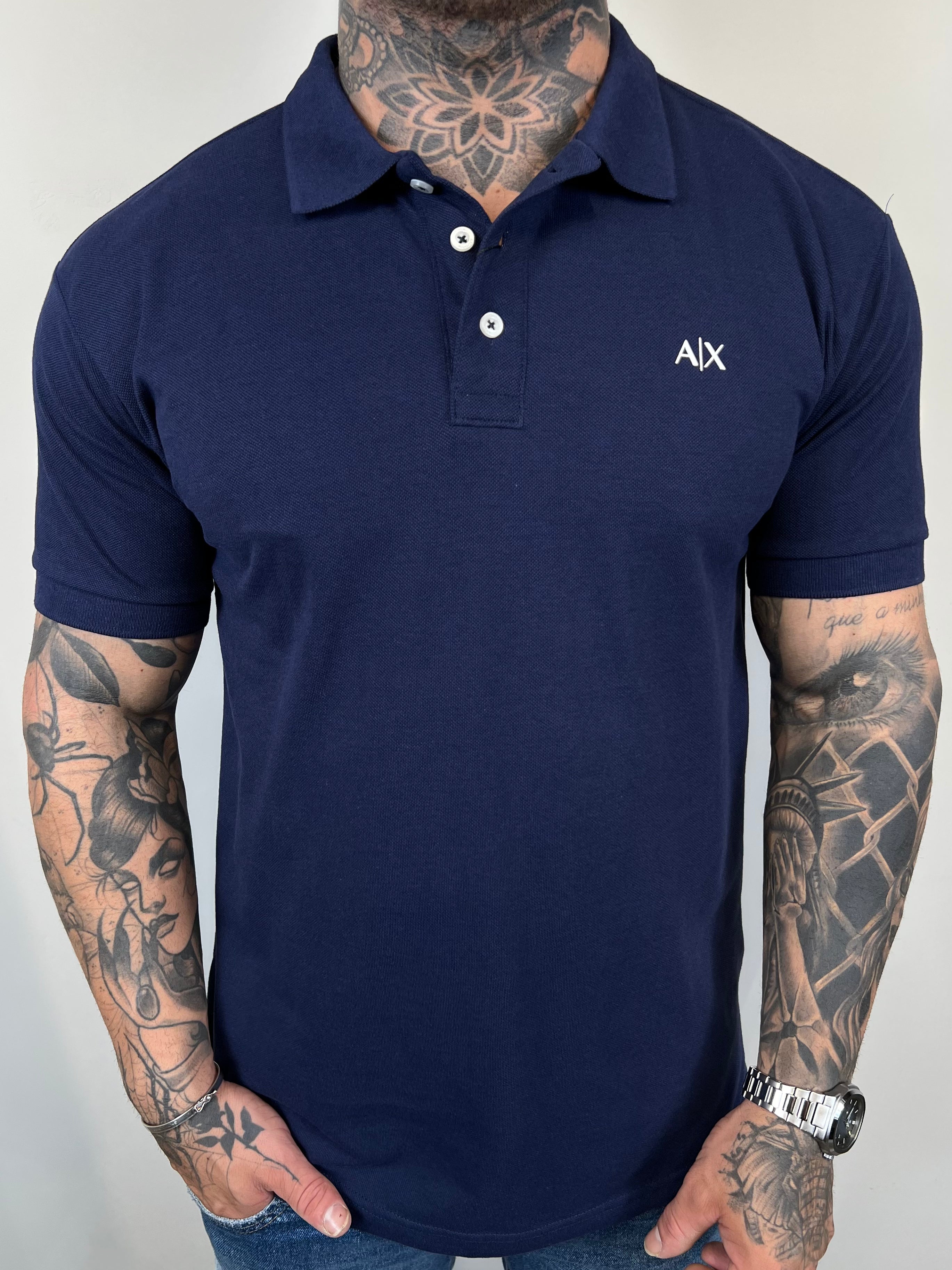 Detalhes: gola polo clássica com carcela de botões, logo AX em evidência, acabamento sofisticado.