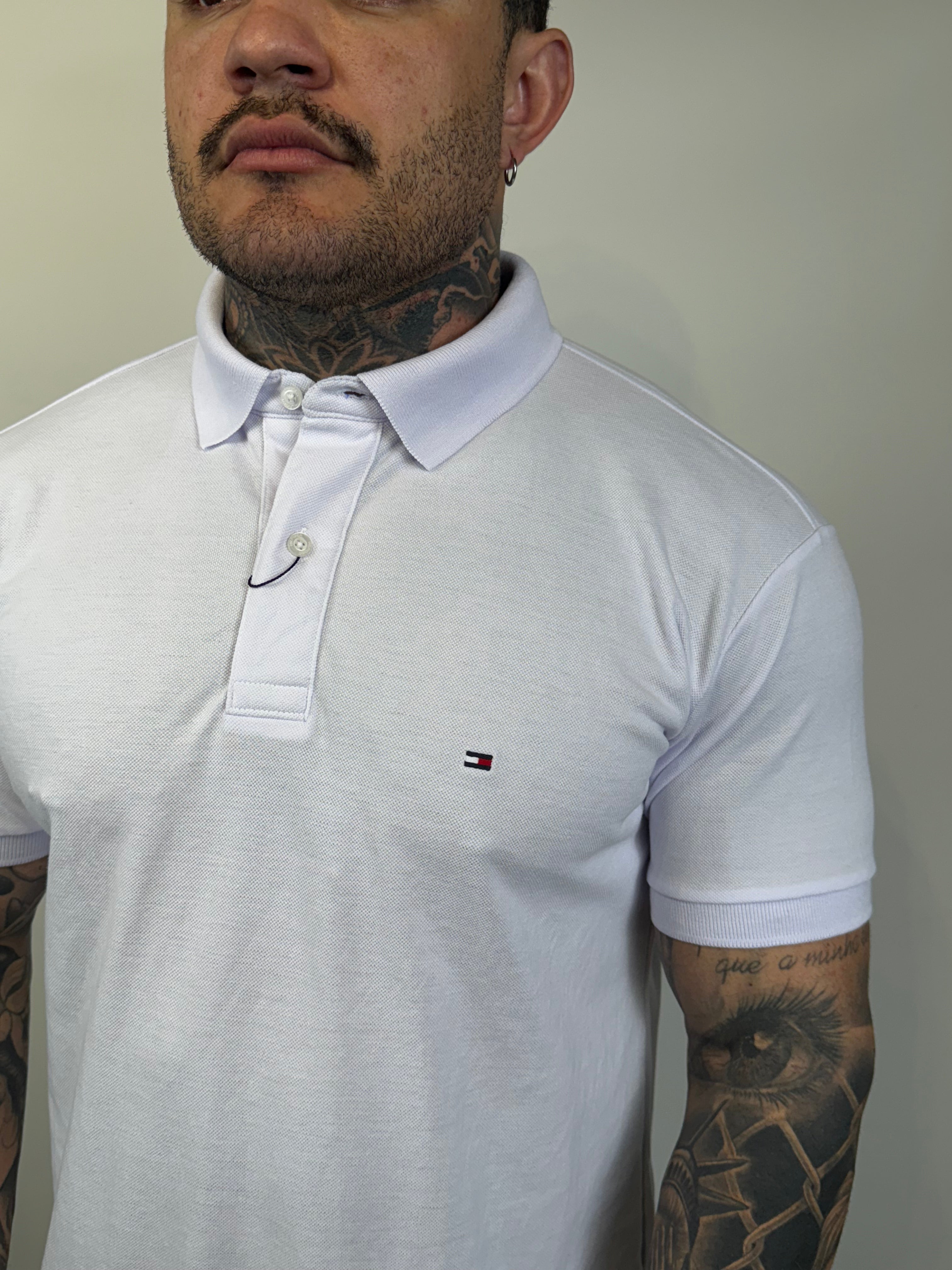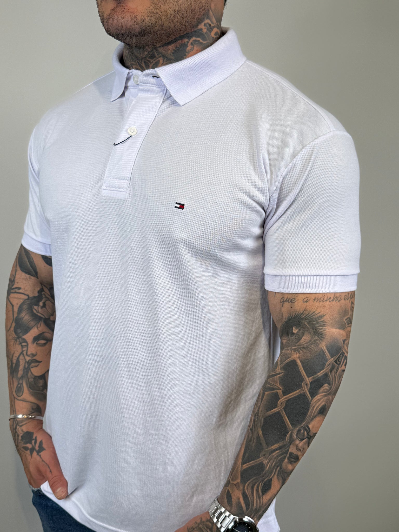 • A gola polo bem estruturada e os punhos com acabamento canelado desenham o perfil da peça com marcas registradas da Tommy Hilfiger — logo bordado na altura do peito que salta sutilmente, cores contrastantes que realçam, faixas ou detalhes que criam profundidade visual.